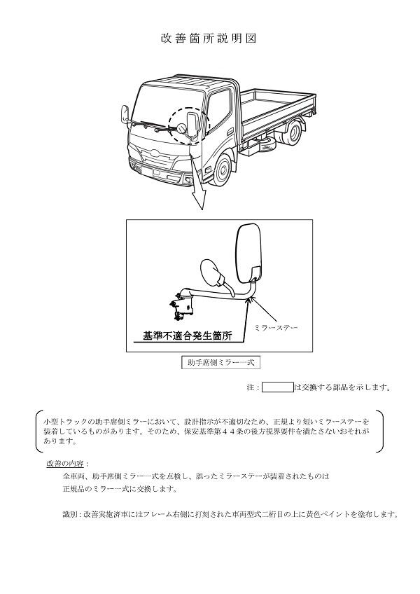 2.改善の内容 全車両、助手席側ミラー一式を点検し、誤ったミラーステーが装着されたものは正規品のミラー一式に交換します。