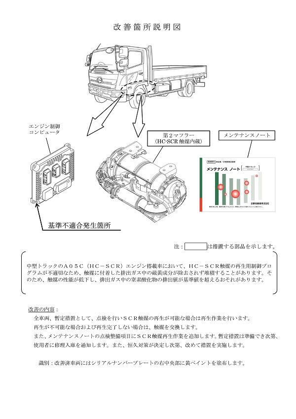 2.改善の内容 全車両、暫定措置として、点検を行いSCR触媒の再生が可能な場合は再生作業を行います。 再生が不可能な場合および再生完了しない場合は、触媒を交換します。 また、メンテナンスノートの点検整備項目にSCR触媒再生作業(無償)を追加します。 恒久対策が決定し次第、改めて措置を実施します。