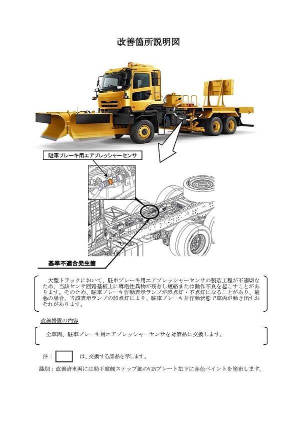 1.不具合の状況 大型トラックにおいて、駐車ブレーキ用エアプレッシャーセンサの製造工程が不適切なため、当該センサ回路基板上に導電性異物が残存し短絡または動作不良を起こすことがあります。そのため、駐車ブレーキ作動表示ランプが誤点灯・不点灯になることがあり、最悪の場合、当該表示ランプの誤点灯により、駐車ブレーキ非作動状態で車両が動き出すおそれがあります。