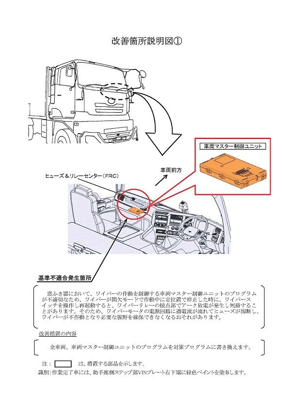 1.不具合の状況 ①窓ふき器において、ワイパーの作動を制御する車両マスター制御ユニットのプログラムが不適切なため、ワイパーが間欠モードで作動中に定位置で停止した時に、ワイパースイッチを操作し再起動すると、ワイパーリレーの接点部でアーク放電が発生し短絡することがあります。そのため、ワイパーモータの電源回路に過電流が流れてヒューズが溶断し、ワイパーが不作動となり必要な視野を確保できなくなるおそれがあります。 ②前照灯の自動点灯機能において、フロントシャシ入出力モジュールのプログラム設定が不適切なため、IG電源オン時に当該モジュール内の処理状況によってはメモリ容量が不足することがあります。そのため、自動点灯・消灯機能が非常用モードになり照度に関係なくすれ違い用前照灯が常時点灯状態となるため、すれ違い用前照灯の自動点灯及び消灯に関する要件に適合しなくなるおそれがあります。