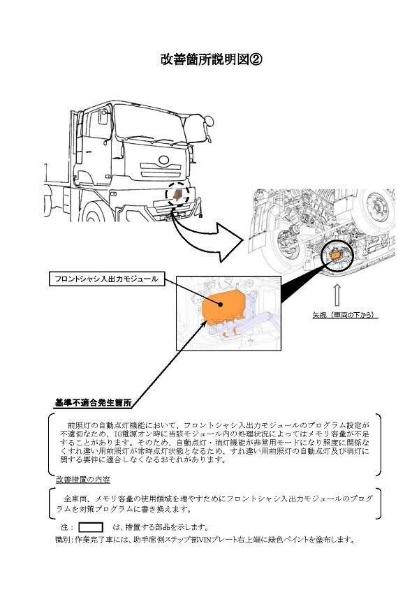 2.改善の内容 ①全車両、車両マスター制御ユニットのプログラムを対策プログラムに書き換えます。 ②全車両、メモリ容量の使用領域を増やすためにフロントシャシ入出力モジュールのプログラムを対策プログラムに書き換えます。