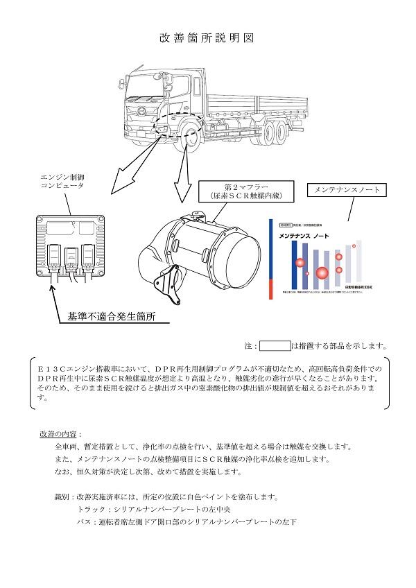 2.改善の内容 全車両、暫定措置として、浄化率の点検を行い、基準値を超える場合は触媒を交換します。 また、メンテナンスノートの点検整備項目にSCR触媒の浄化率点検を追加します。 なお、恒久対策が決定し次第、改めて措置を実施します。