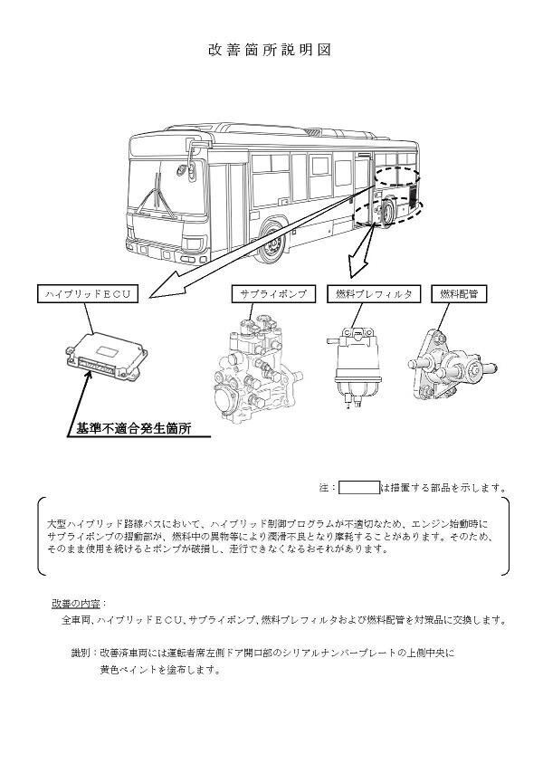 1.不具合の状況 大型ハイブリッド路線バスにおいて、ハイブリッド制御プログラムが不適切なため、エンジン始動時にサプライポンプの摺動部が、燃料中の異物等により潤滑不良となり摩耗することがあります。そのため、そのまま使用を続けるとポンプが破損し、走行できなくなるおそれがあります。