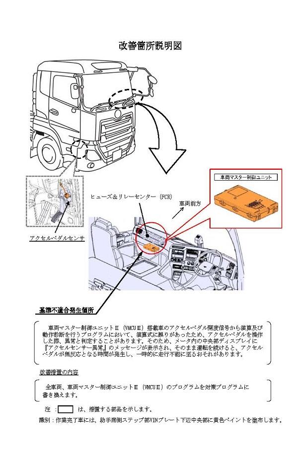 1.不具合の状況 車両マスター制御ユニットⅡ(VMCUⅡ)搭載車のアクセルペダル開度信号から演算及び動作診断を行うプログラムにおいて、演算式に誤りがあったため、アクセルペダルを操作した際、異常と判定することがあります。そのため、メータ内の中央部ディスプレイに『アクセルセンサー異常』のメッセージが表示され、そのまま運転を続けると、アクセルペダルが無反応となる時間が発生し、一時的に走行不能に至るおそれがあります。