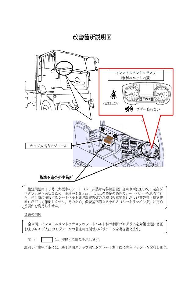2.改善の内容 全車両、インストルメントクラスタのシートベルト警報制御プログラムを対策仕様に修正およびキャブ入出力モジュールの着座判定閾値のパラメータを書き換えます。