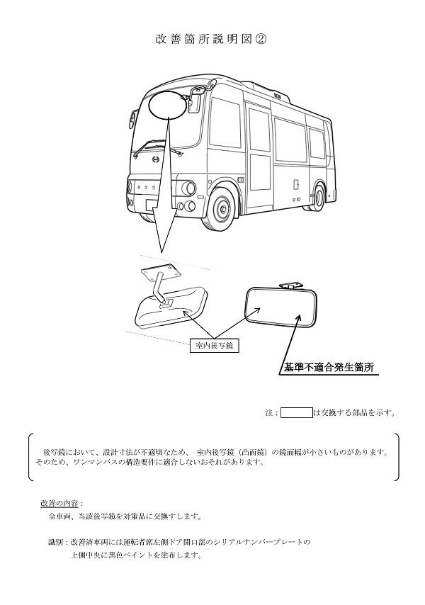 1.不具合の状況 後写鏡において、設計寸法が不適切なため、 ①左側後写鏡の鏡面曲率半径が小さいものがあります。 ②室内後写鏡(凸面鏡)の鏡面幅が小さいものがあります。 そのため、ワンマンバスの構造要件に適合しないおそれがあります。