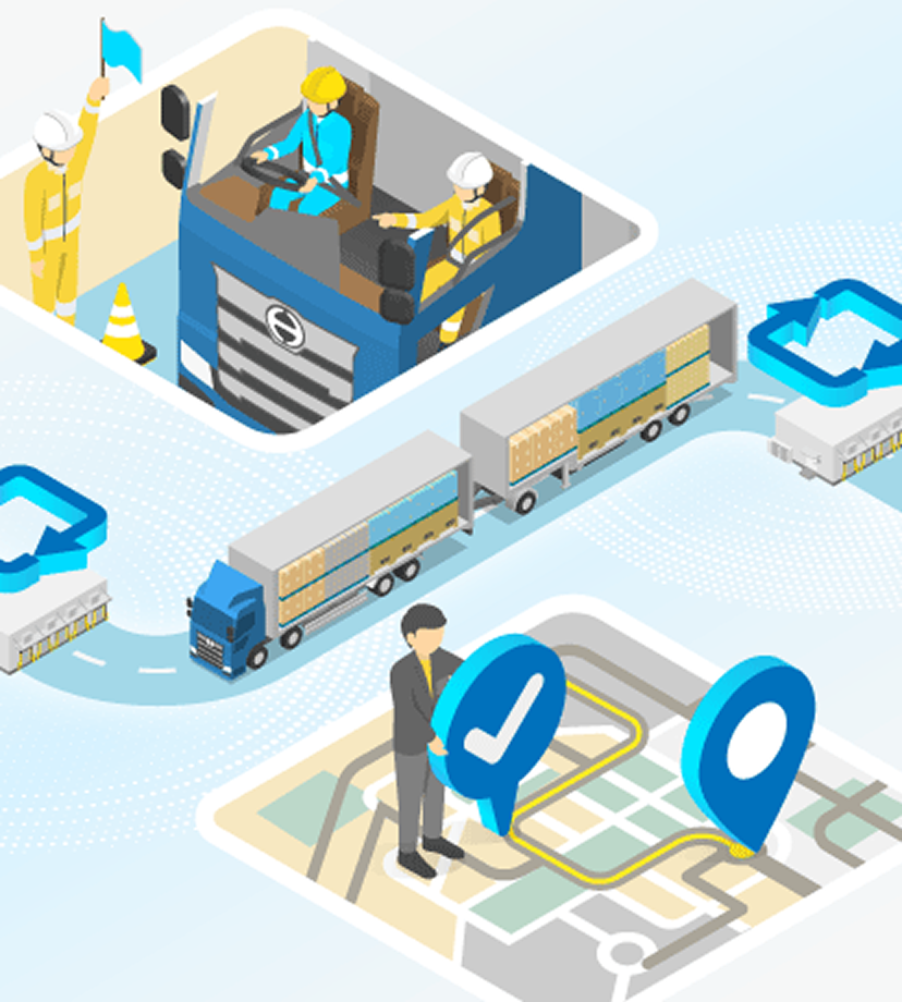 深刻化するドライバー不足解消と環境負荷低減の両立に向け、全長25メートルのダブル連結トラック導入を支援します。走行ルートの検討から拠点内動線・運行ダイヤの設計、ドライバー教育、さらには関係機関との調整まで、ワンストップで伴走。お客様の構想を確実に運行へとつなげ、持続可能な物流の実現に貢献します。
